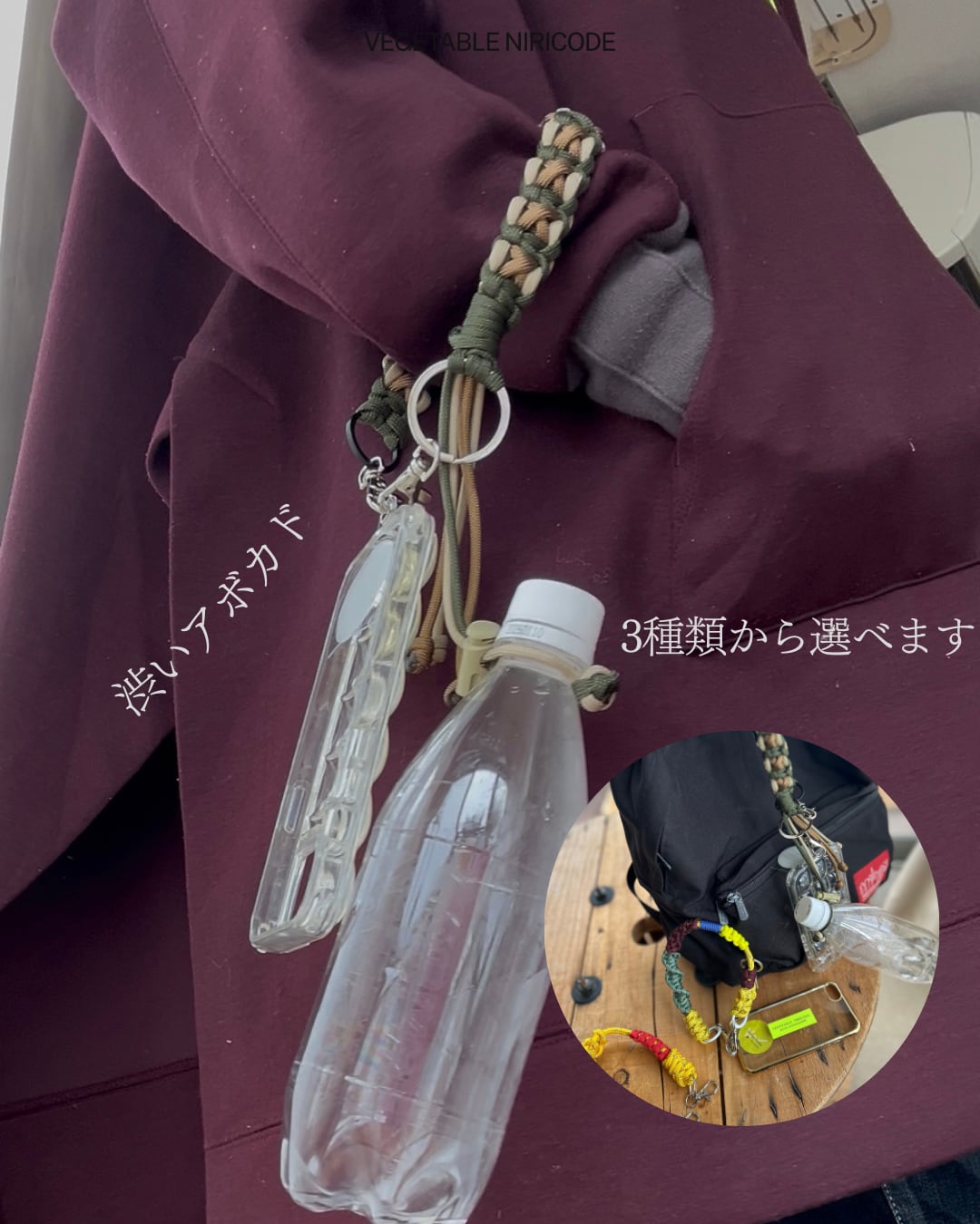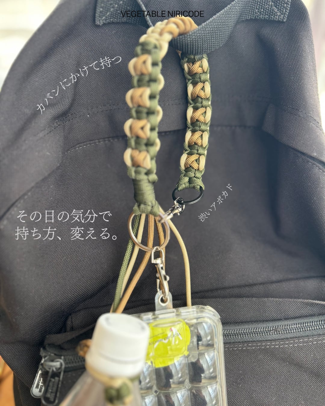 手首にかけてショートバッグの持ち手として使う、バッグのチャームとして常につけておく、どちらでも使えます。