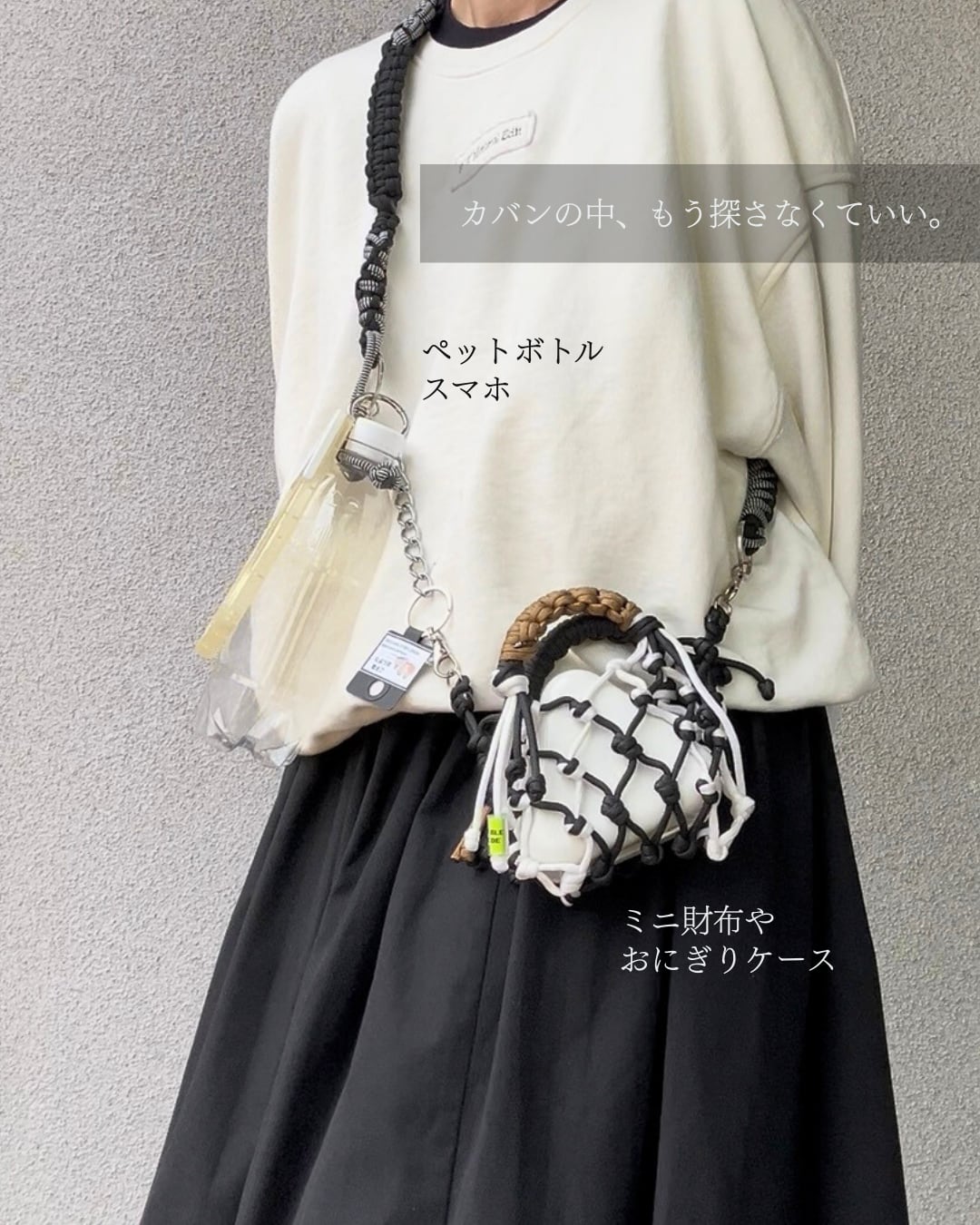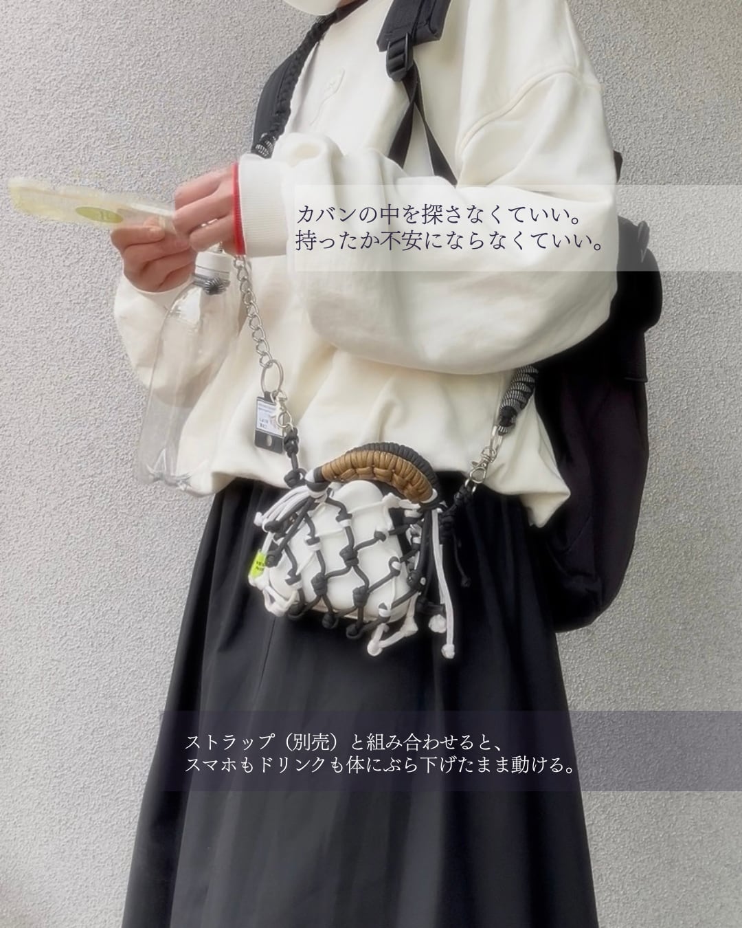 スマホもドリンクも体にぶら下げたまま動ける。